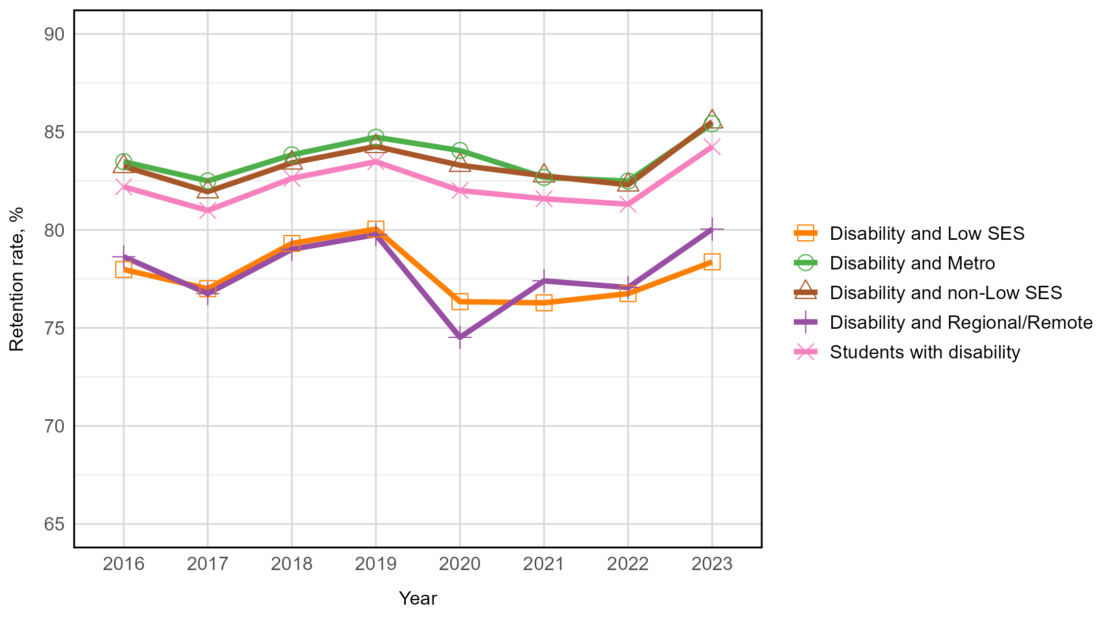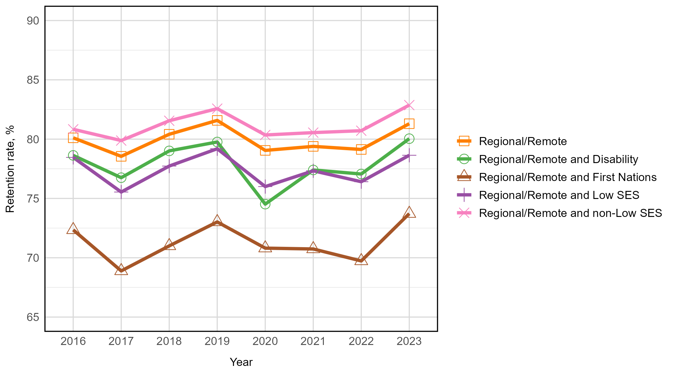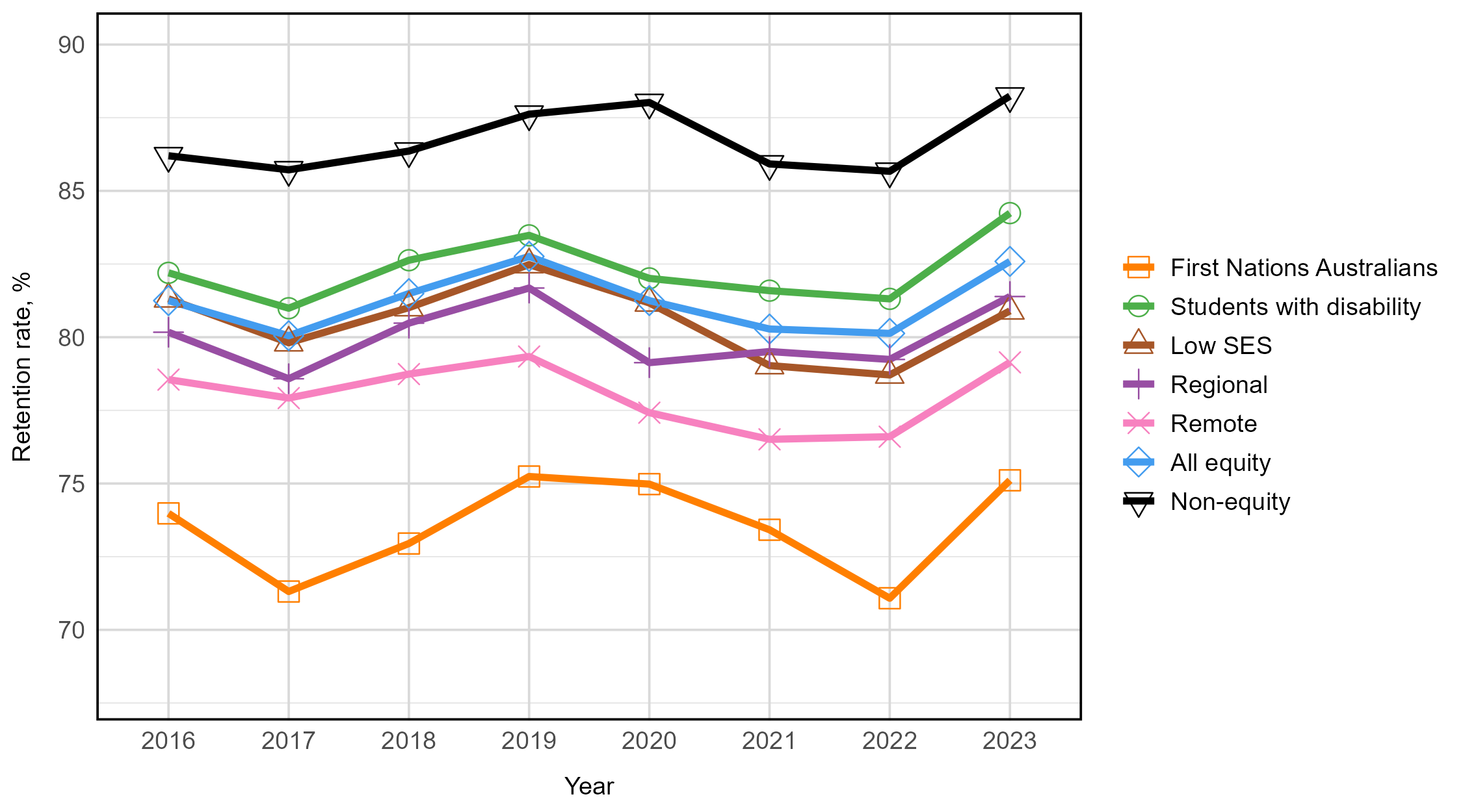Between 2016 and 2023, non-equity students consistently had higher retention rates than each of the equity groups. All student groups, apart from students from low SES areas, had higher retention rates in 2023, compared to 2016. Students from low SES areas had a decline in retention of 0.4 percentage points (81.3% in 2016 and 80.9% in 2023). First Nations Australian students had the lowest retention rate across all years.