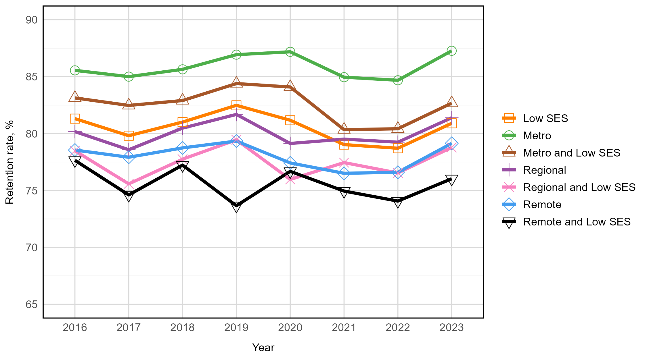 Students from remote and low SES areas had consistently lower retention rates