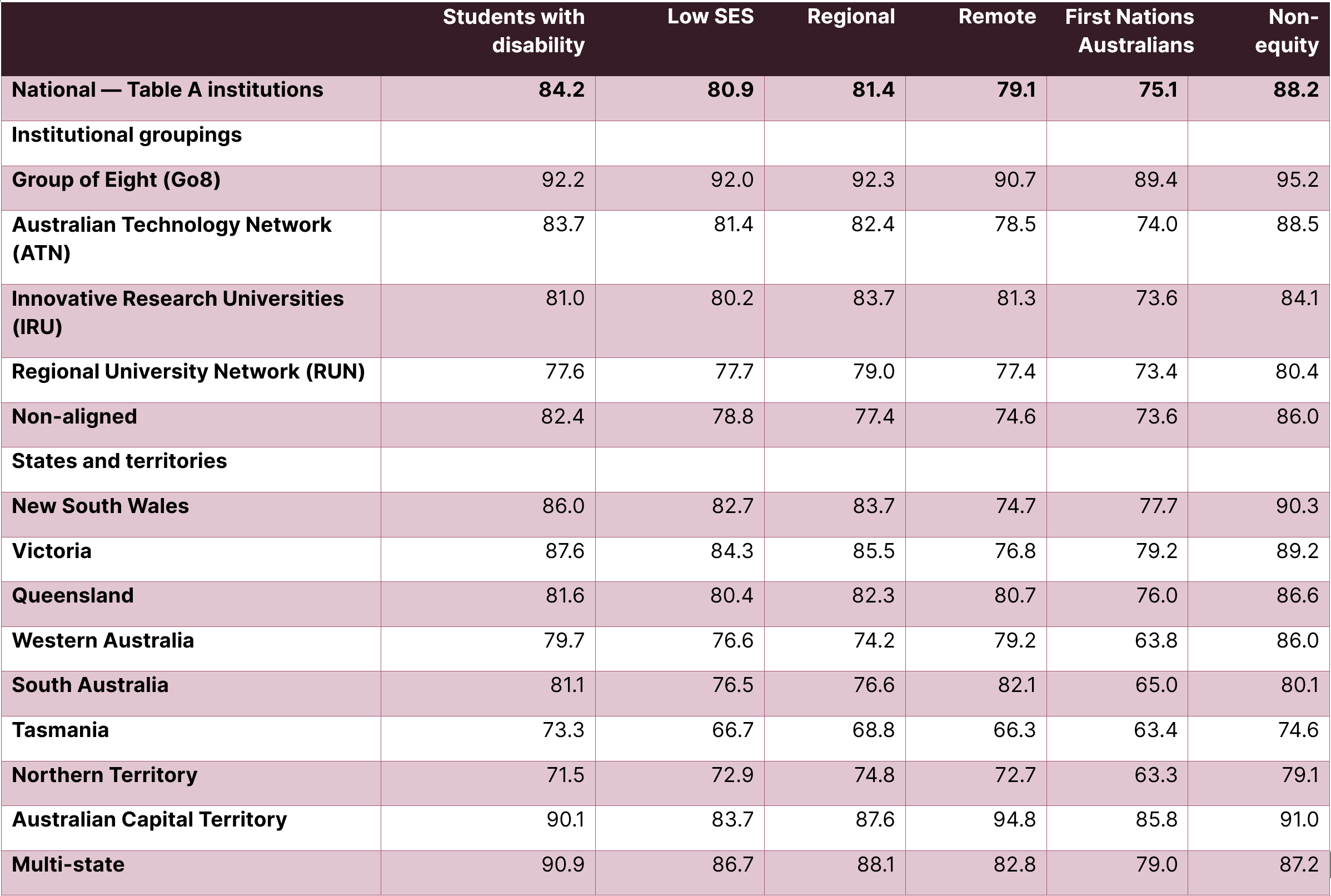Across all Table A institutions, retention was highest for non-equity students. Among institutional groupings, Go8 universities had the highest average retention rate across all student groups. There were noticeable differences between the states and territories in terms of retention rates. The Australian Catholic University (the only multi-state university) had the highest retention rates for students with disability, students from low SES areas, and students from regional areas. The Australian Capital Territory had the highest retention rates for students from remote areas, First Nations Australian students, and non-equity students.