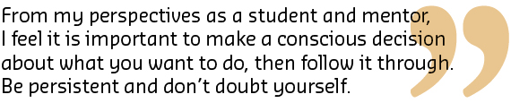 From my perspectives as a student and mentor, I feel it is important to make a conscious decision about what you want to do, then follow it through. Be persistent and don’t doubt yourself; if you put in your best effort, you can achieve anything. My advice to other students is to keep in mind that academic staff aren’t asking you to do things to make your life difficult, they are doing it so you can learn the skills you need for your subsequent profession. The more you do, the more you will know how to do, and the more choices you will have.